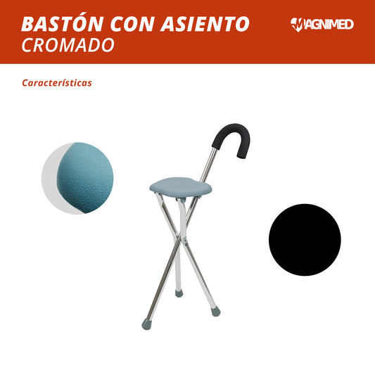 Bastón Banco Con Asiento Para Descanso Plegable Cromado Ergonómico De 3 Apoyos